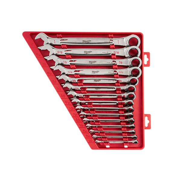 Our ratcheting combination wrench set features ink-filled size labels for easy size identification, as well as quick distinction between SAE and metric sets. The 48-22-9416 Milwaukee SAE Ratcheting Combination Wrench 15PC Set comes in a tray designed for steel storage drawers, allowing for efficient storage with no wasted space.