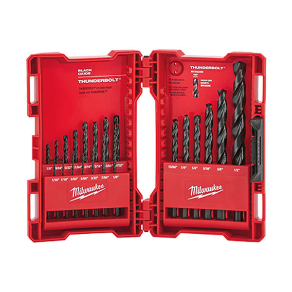 48-89-2801 Milwaukee THUNDERBOLT Black Oxide Drill Bit 21PC Set are effective for drilling on curved surfaces. The Milwaukee THUNDERBOLT Black Oxide Bits require less effort to drill through metal, wood and PVC, and are highly recommended for use with portable drills.
