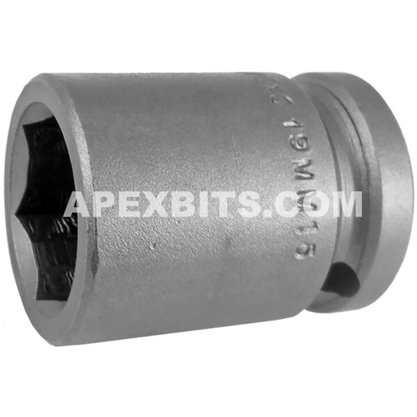 Apex® 19MM15 19mm 6-Point Standard Impact Socket, 1/2” Square Drive. Socket Type: 6-Point Hex Opening: 19mm Overall Length: 38.1mm Nose End Diameter: 28.6mm Drive End Diameter: 28.6mm Opening Depth: 11.9mm