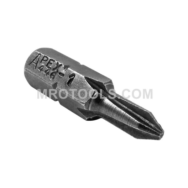 Apex® 446-1I #1 Phillips® Insert Bits, 1/4” Hex Drive, Limited Clearance. Point Size: #1 Drive Type: Hex Insert Drive Size: 1/4” Hex Drive Overall Length: 1” Bit Type: Limited Clearance Bit Hardness: Intermediate Hardness