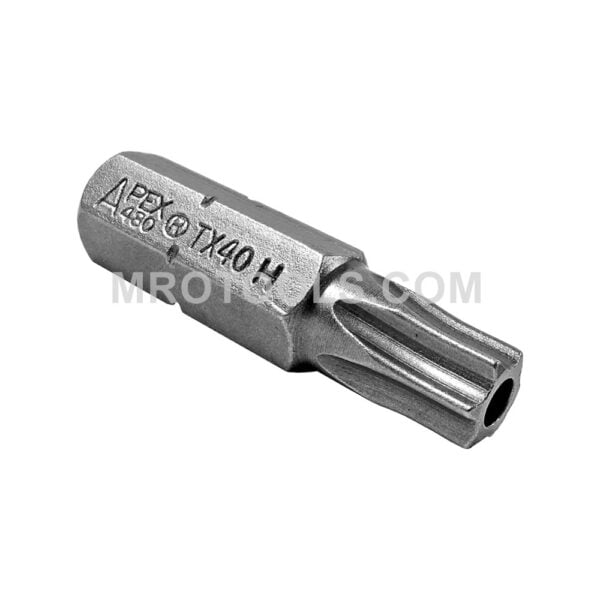 Apex® 480-TX-40-H T-40-H Torx Tamper Resistant Insert Bits, 5/16” Hex Drive. Driver Size: T-40-H Major Diameter: 0.260” Overall Length: 1-1/4” / 32mm