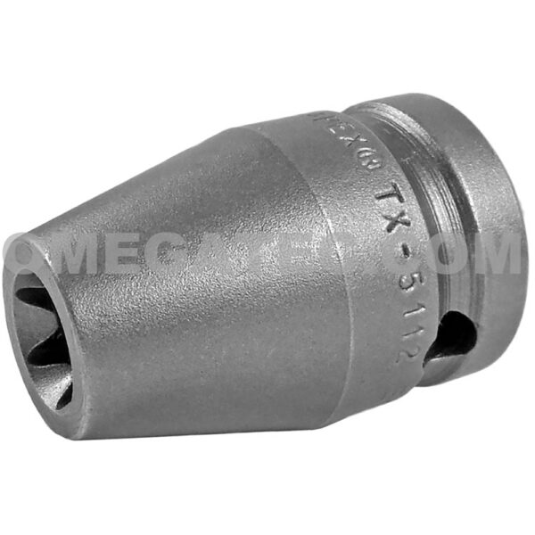 Apex® TX-5112 E-12 Standard Torx® Impact Socket, For External Screws, 1/2” Square Drive. Drive Size: E-12 Overall Length: 1-1/2” / 38mm Nose End Diameter: 5/8” / 16mm Drive End Diameter: 1” / 25mm