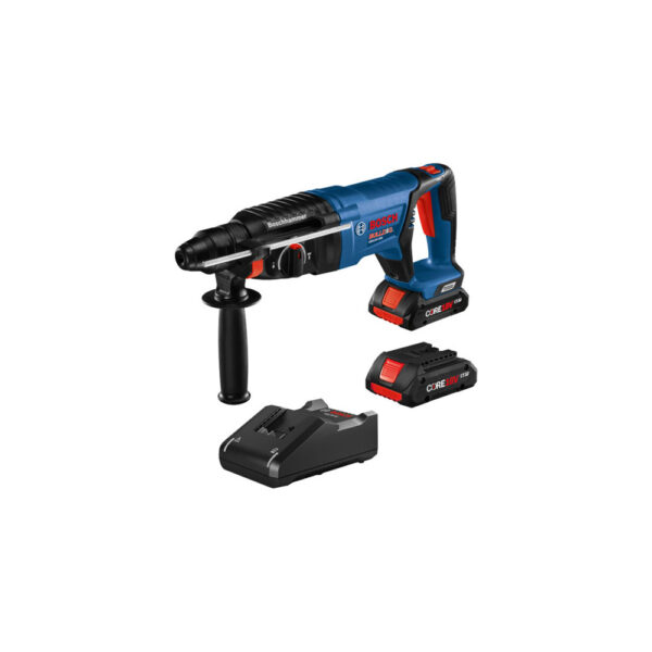 GBH18V-26DK25 Bosch 18V Brushless SDS-plus® Bulldog 1” D-Handle Rotary Hammer Kit includes two CORE18V 4.0 Ah Compact Batteries, which deliver lightweight, high power, and are equipped with CoolPack technology for extended life. The tool features a jobsite-proven D-handle design with soft-grip and is ideal for overhead, horizontal and downward drilling applications. It also has KickBack Control, an integrated sensor to stop tool rotation in bind-up situations. The hammer features a variable-speed reversing trigger for accurate bit starting.