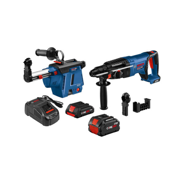 GBH18V-26DK26GDE Bosch 18V Brushless SDS-plus® Bulldog 1” D-Handle Rotary Hammer Kit with Mobile Dust Extractor and (2) CORE18V Batteries GBH18V-26DK26GDE Bosch 18V Brushless SDS-plus® Bulldog 1” D-Handle Rotary Hammer Kit delivers the maximum in mobility, impact and movement toward OSHA compliance. The GBH18V-26DK26GDE Bosch 18V Brushless SDS-plus® Bulldog 1” D-Handle Rotary Hammer Kit includes the 18V EC Brushless 1 In. SDS-plus® Bulldog™ Rotary Hammer, a cordless SDS-plus® Mobile Dust Extractor and two CORE18V Lithium-ion batteries. The GBH18V-26D D-handle hammer consistently outperforms the best-selling 1 In. corded 11255VSR Bulldog™, making it better than the best. The hammer delivers 1.9 Ft.-Lbs. of impact energy, based on the European Power Tool Association (EPTA) industry standard. It weighs only 5.8 Lbs. (tool only, not including battery), for an outstanding impact-to-weight ratio. The cordless GDE18V-26D Mobile Dust extractor features a HEPA filter, helping users move toward compliance with OSHA silica regulations. The dust canister capacity can accommodate up to 20 holes using a 1/2 In. diameter bit, drilling 2 In. deep into concrete. The CORE18V batteries include an 8.0 Ah Performance and a 4.0 Ah Compact. Engineered with 21700 cell technology, they deliver advanced power plus CoolPack 2.0 technology to manage the heat.