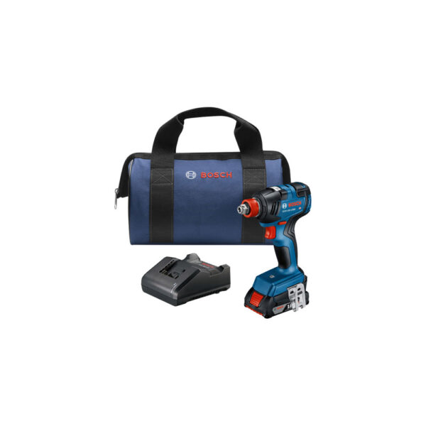 GDX18V-1800B12 Bosch 18V Brushless 1/4” and 1/2” Two-in-One Impact Driver Kit w/ (1) 2.0 Ah SlimPack Battery The GDX18V-1800B12 Bosch 18V Brushless 1/4” and 1/2” Two-in-One Impact Driver Kit is half driver, half wrench, all impact. The GDX18V-1800B12 Bosch 18V Brushless 1/4” and 1/2” Two-in-One Impact Driver Kit delivers results, with the two-in-one bit/socket drive that offers a 1/4 In. quick-change hex shank holder with power groove for bits, and a 1/2 In. square drive for sockets. GDX18V-1800B12 Bosch 18V Brushless 1/4” and 1/2” Two-in-One Impact Driver Kits efficient, powerful EC Brushless motor produces up to 1,800 In.-Lbs. of torque, while the Bosch hammer-and-anvil system provide maximum impact energy and up to 0-4,200 impacts per minute. The variable-speed trigger provides accurate driving speed. The two-in-one bit/socket drive increases both convenience and power. Bits can stay conveniently inserted when using deep sockets, and more torque is transferred directly thru the 1/2 In. square drive anvil. There is no more torque loss through socket adapters or broken socket adapters. The driver has an LED light to illuminate the work area. GDX18V-1800B12 Bosch 18V Brushless 1/4” and 1/2” Two-in-One Impact Driver Kit comes with one 18V 2.0 Ah SlimPack battery and a charger.