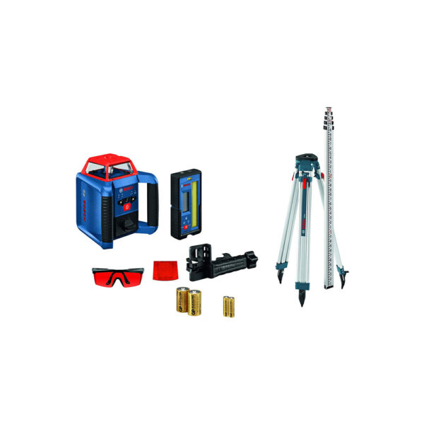1 All-In-One Hard Carrying Case, 1 BT160 Aluminum Contractor Tripod, 1 GR13 13 Ft. Grade Rod, 1 GRL2000-40H REVOLVE2000 Self-Leveling Horizontal Rotary Laser, 1 LR20 Laser Receiver with Bracket, 1 Red Laser Glasses, 1 Red Target Plate, 2 AA Batteries, 2 D-Cell Batteries
