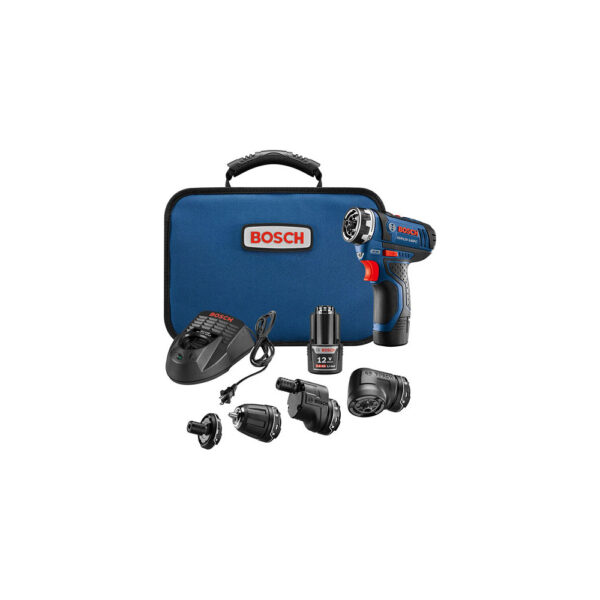 GSR12V-140FCB22 Bosch 12V Max FlexiClick 5-in-1 Drill Driver Kit features four attachments a locking bit holder, a keyless chuck, an offset angle and a right angle each attach to the tool securely and easily with the One-Click interface. The right angle attachment is for tight spaces, and it works with all three other adapters. The offset angle attachment delivers precise screwdriving close to edges. Both of these attachments rotate to 16 positions without removing them. The locking bit holder attachment locks hex bits for high-torque drilling, while the keyless chuck provides locked In. drilling.