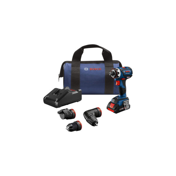 GSR18V-535FCB15 Bosch 18V Brushless Connected Ready FlexiClick 5-in-1 Drill Driver Kit w/ (1) CORE18V 4.0 Ah Compact Battery The GSR18V-535FCB15 Bosch 18V Brushless Connected Ready FlexiClick 5-in-1 Drill Driver Kit is designed for professionals who are looking for a high-torque connected-ready drill/driver that redefines their limits to get the tough jobs done. The drill can produce up to 535 In.-Lbs. of torque. Users may also add an optional rotary hammer adapter (not included), converting the drill into an SDS-plus® rotary hammer, for drilling into masonry. GSR18V-535FCB15 Bosch 18V Brushless Connected Ready FlexiClick 5-in-1 Drill Driver Kit has a 1/4 In. hex bit holder with quick release, and the system includes three pro-grade attachments: a right-angle, an offset-angle and a 1/2 In. keyless metal chuck attachment. GSR18V-535FCB15 Bosch 18V Brushless Connected Ready FlexiClick 5-in-1 Drill Driver Kit includes a CORE18V 4.0 Ah Compact Battery with next-gen Li-ion 21700 cell technology and an 18V charger.