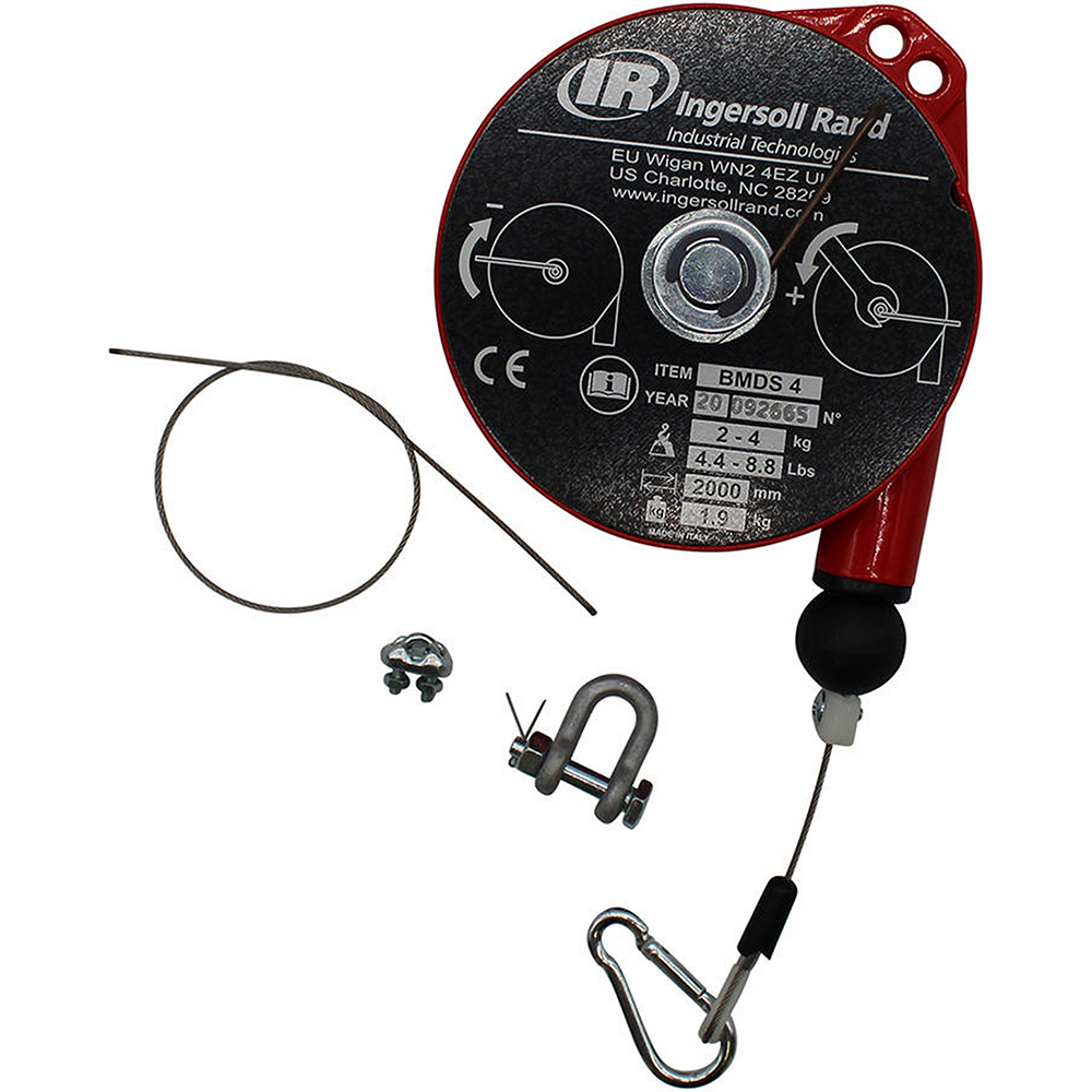 Built with user-focused innovation, the Ingersoll Rand BHD-55 Heavy Duty Spring Balancer, 99-121lbs provides several key advantages: Stainless steel cable and anti-friction cable guide. Gravity-free suspension capability. Ribbed and sealed monobloc construction in aluminum alloy. Safety device against load dropping due to the spring breakage (>6.5lbs). Locking device to block the load at any height. Upper rotary suspension with safety hook. Adjustable stroke limiting device.