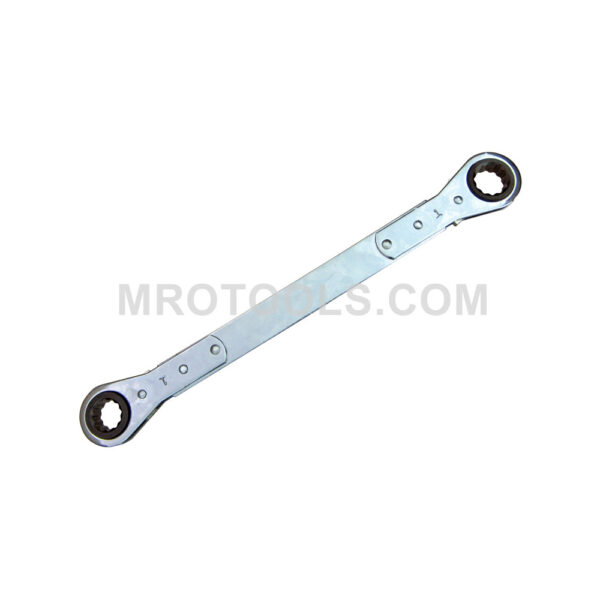 Lang 8666 Flat Ratcheting Box Wrench, 12 Point, Extra Long, Metric. Socket Size: 17mm x 19mm Point Size: 12 Width: 1 19/64” – 1 7/16” Thickness: 1/2” Overall Length: 12”
