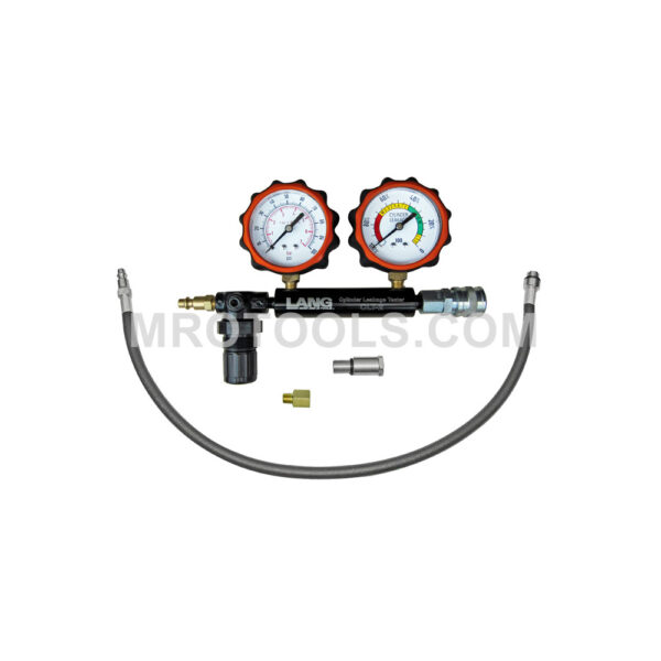 Lang cylinder leakage tester with 2 gauges – 35 PSI measures the ability of an engine cylinder to hold compressed air using shop air pressure and supplements a compression tester. The Lang cylinder leakage tester has a precision regulator, an M14 standard reach adapter on a 26” hose assembly and an M14 long reach solid adapter. The The Lang cylinder leakage tester features a 2 1/2” special gauge has one multicolored band for measuring low, moderate and high leakage, and a scale range from 0-100%. The second gauge is 2 1/2” and has a dual scale dial PSI and bar, which allows the technician to monitor input air-line pressure.