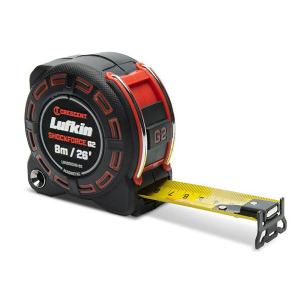Additionally, the Lufkin LM1225CME-02 1-1/4” x 8m/26′ Shockforce G2 Magnetic Tape Measure is equipped with an improved diamond-coated end hook. This design protects the entire front of the tape, preventing snagging and tearing, and enhances its magnetic end hook’s grasp on any metal surface, making it perfect for one-person measurements.