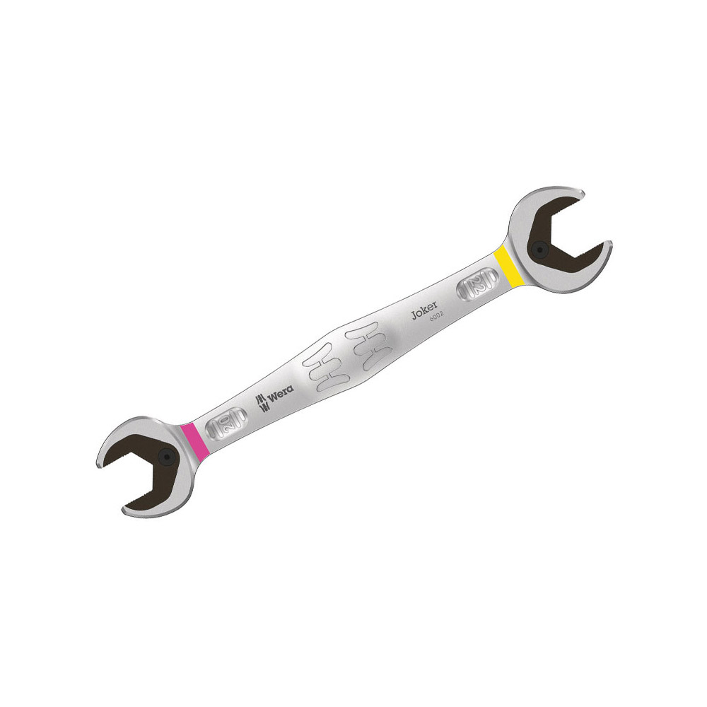 Wera 05003760001 6002 Joker Double Open-Ended Wrenches are a high-quality, metric double spanner with everything a wrench can do and so much more. Faster, better, more beautiful. A real Joker! The new generation of double open-ended spanners. For hexagon screw heads and bolts. With holding function by a metal plate in the mouth, which reduces the risk of losing screws and sockets. With its extra hard teeth the exchangeable metal plate in the mouth secures screws and sockets and reduces the risk of slipping.