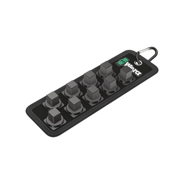 Including snap hooks for attachment to belt loops or bags. Fleece back and hook and loop fastener strips for easy attachment e.g. to wall, shelf, workshop trolley and Wera 2go tool transport system.