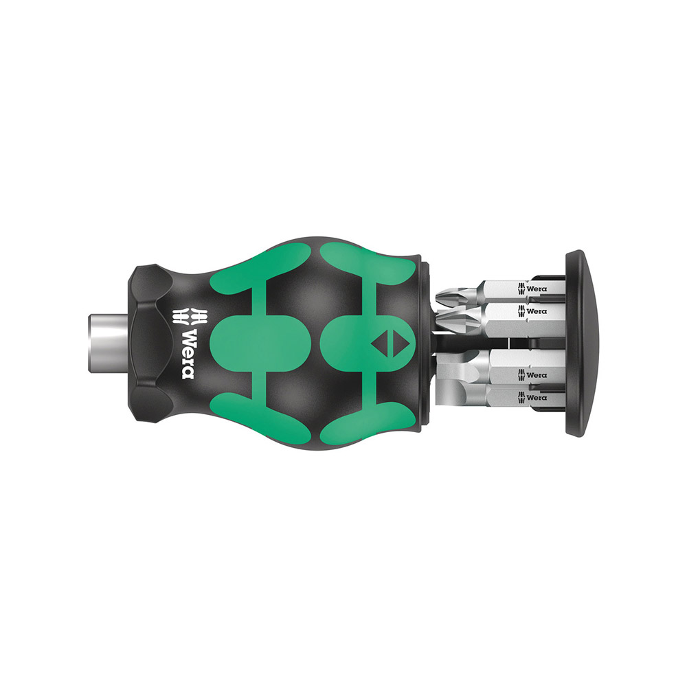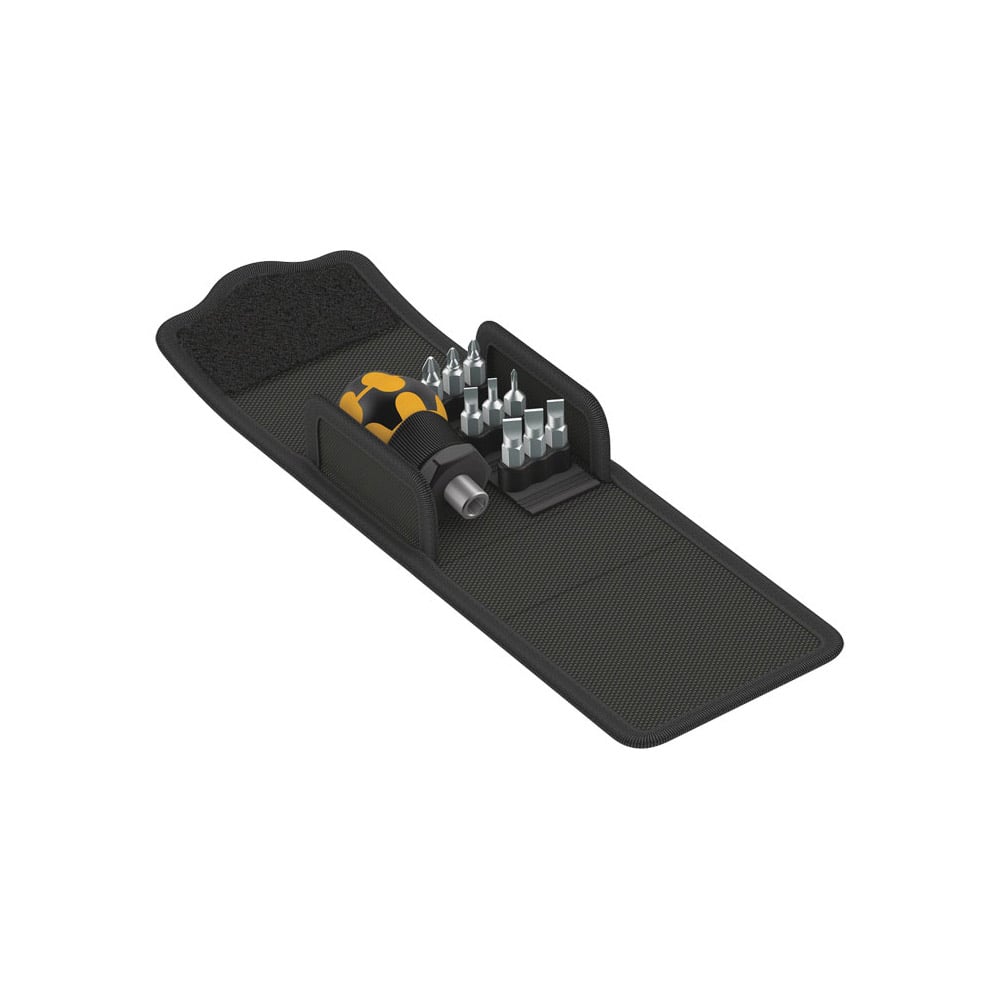 Wera 05004179001 Bicycle Set 11 7 Piece features a particularly small bit hand-holder with short bit mounting for hard to reach areas with a ratchet function and fine toothing for a low return angle and a easy to operate reversible ring. Wera 7 Piece Bicycle Set 11 also includes 7 stainless steel bits, 6 of which are located in a magazine in the handle and one in the bit holder. The strong permanent magnet in the bit mounting ensures secure holding of the bit. Wera 7 Piece Bicycle Set 11 features a 2-component Kraftform handle with the practical combination of hard and soft zones that allow for a firm grip and precise working and feature Weras take it easy tool finder with size stamping and color coding by output to help you find the required bit easily.
