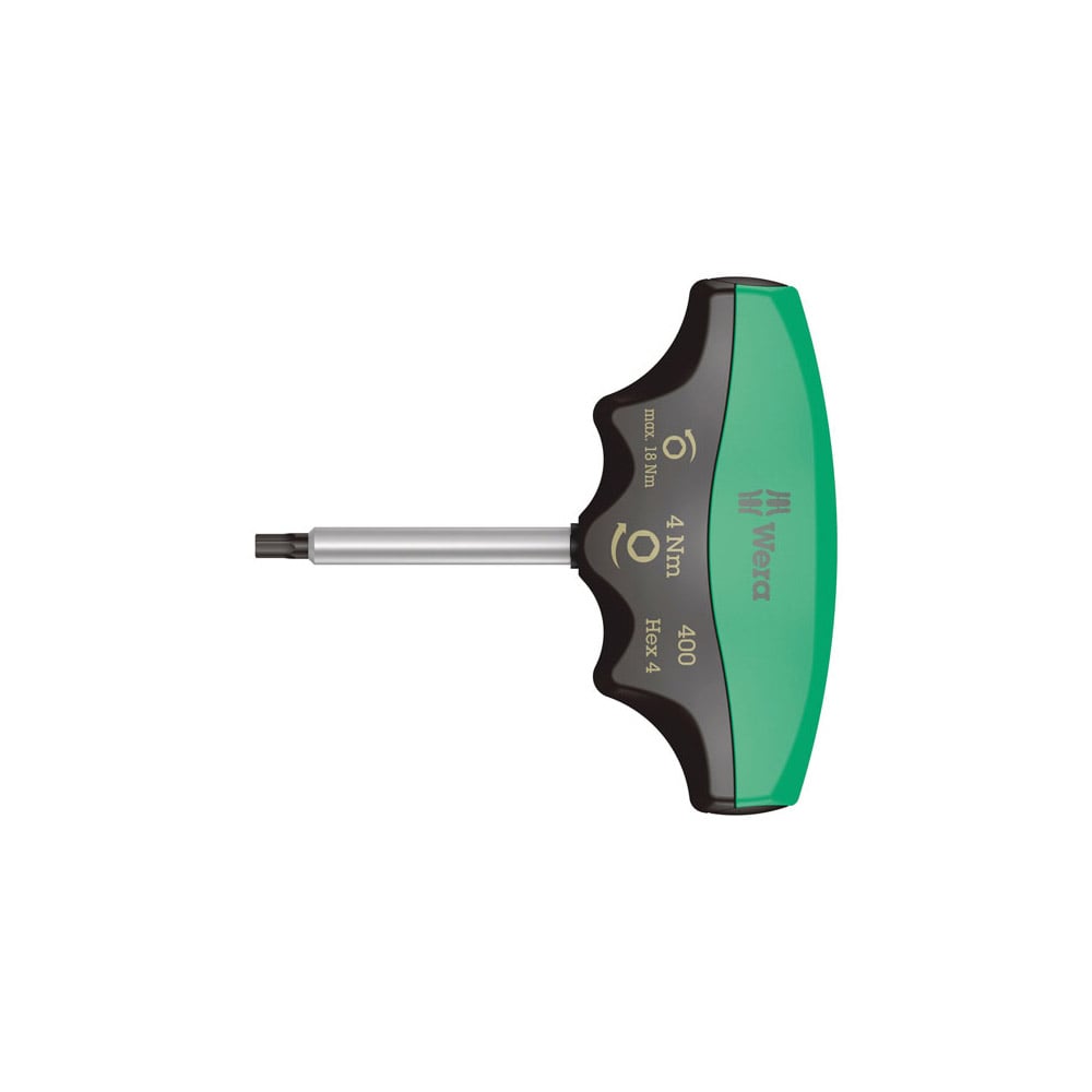 Wera 05004980001 400 i VDE Insulated Hex Torque-Indicator T-Handle. Point Size: 4.0mm Main Scale Pre-Set Reading: 5.0 Blade Length: 90mm/3 1/2” Handle Length: 48mm Handle Diameter: 100mm Blade Diameter: 8mm Blade Diameter without Insulation Layer: 6mm